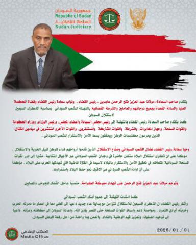 يتقدم صاحب السعادة/ مولانا عبد العزيز فتح الرحمن عابدين - رئيس القضاء - وقضاة المحكمة العليا والسادة القضاة بجميع درجاتهم والعاملين والشرطة القضائية بالتهنئة للشعب السوداني بمناسبة الذكرى السبعين لاستقلال السودان.
